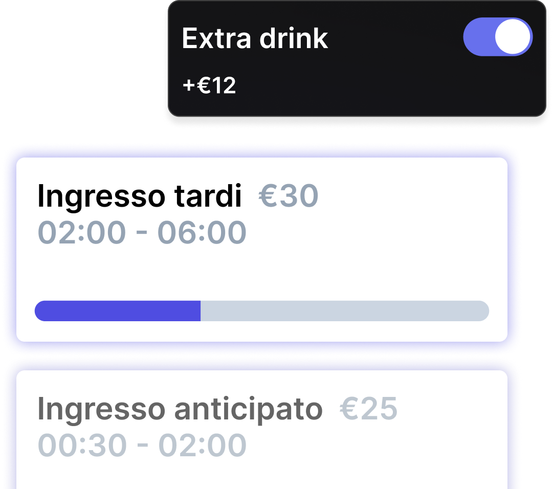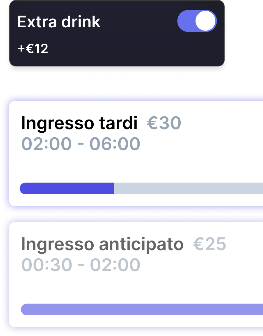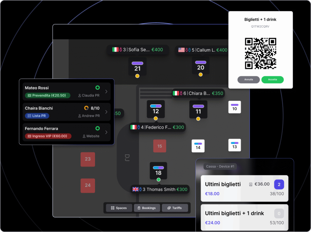 Gestisci in tempo reale capienza, tavoli, spesa degli ospiti e flusso della biglietteria. Aggiorna subito prezzi, disponibilità e setup del tuo locale, tutto da un’unica piattaforma.